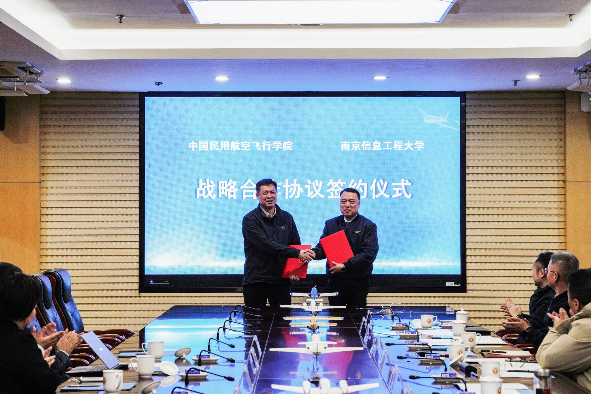 马建新代表学院对陈海山一行的到来表示欢迎。他表示,近年来,中飞院主动对接行业发展需求,同时积极拓展国际合作领域,行业服务能力与国际影响力得到持续提升。南京信息工程大学在大气科学、人工智能、计算机科学等领域积淀深厚,与中飞院的航空特色互补性强,双方合作前景广阔。他希望以此次战略合作协议签署为契机,在科研平台共建、人才联合培养、资源共享等方面深化合作,携手破解行业难题,共同为服务国家战略发展需求贡献力量。